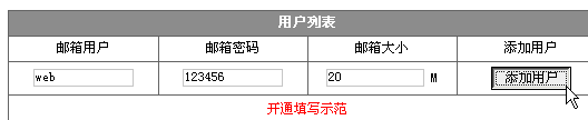 这里以添加web@test.com为例:1> 进入企业邮局管理界面:2> 在"邮局用户管理"页面,填入"web",注意不能填入"web@test.com"然后填入邮箱登录密码以及分配邮箱大小,点击"添加用户"即可: 开通后如下图所示: