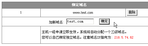 2> 在"基本管理功能"页面,在如下图示中填入新的域名,点"确定"即可,当然前提是要先把域名解析到主机IP地址上(域名帮助中有图示)