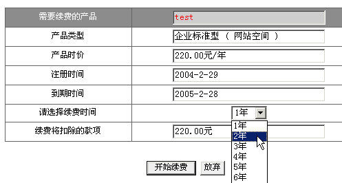 2> 点击"虚拟主机续费",选择需要续费的年限并点击"开始续费"即可。